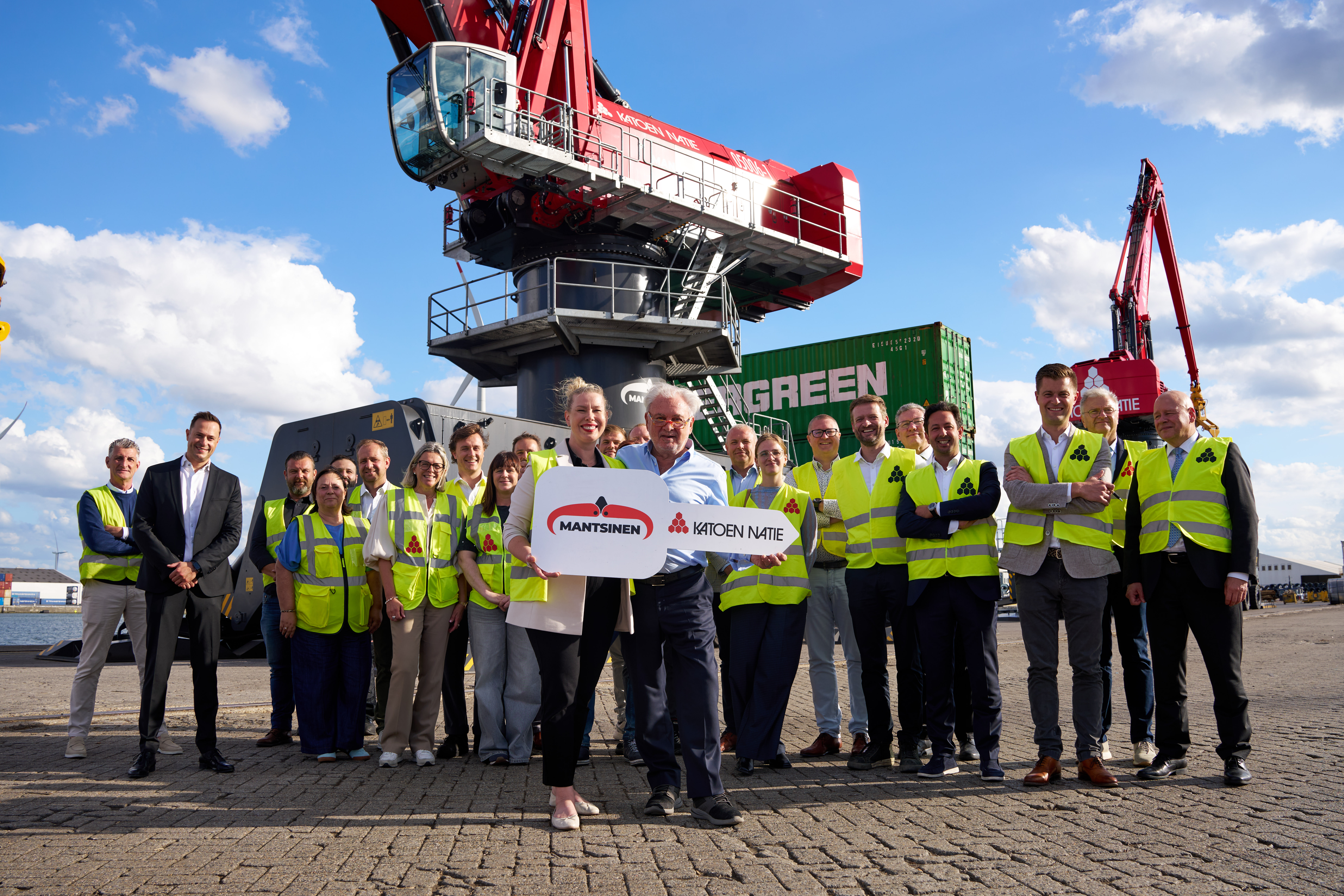 Op 1 september vond de officiële inhuldiging van de kranen plaats in aanwezigheid van Katoen Natie-voorzitter Fernand Huts en Mia Mantsinen, CEO van Mantsinen Group. Tijdens de ceremonie ontving Huts niet alleen de symbolische sleutel van de nieuwe machines, maar ook een bijzonder kunstwerk van de Belgische kunstenaar D.D. Trans: een miniatuur Mantsinen-kraan gecombineerd met een dinosaurus. Het speelse werk verwijst naar het T-Rex skelet dat Huts recent aankocht voor het Boerentorenproject.